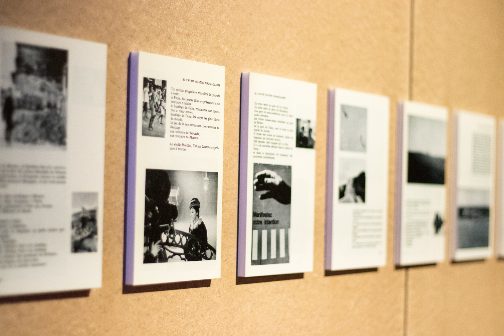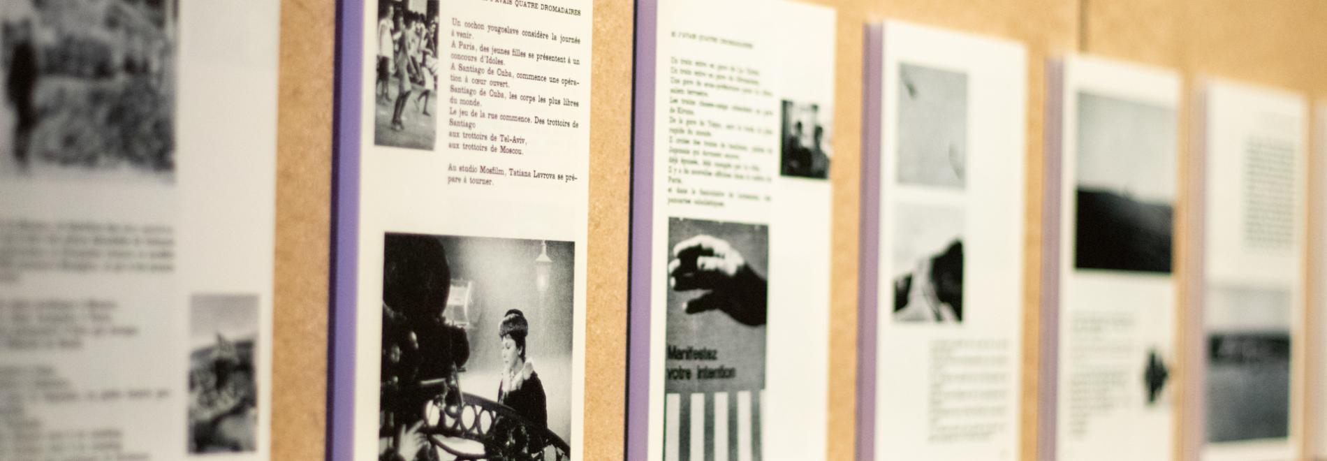 L’exposició estableix vincles entre tota mena d’imatges, tant si són fixes com en moviment, analògiques o digitals; entre una selecció de les seves fotografies en blanc i negre i els seus primers «curtmetratges» publicats a les guies de la col·lecció Petite Planète; entre la seva «cinenovel·la», els seus primers collages, així com plans fixos de La jetée (El muelle) i de Si j’avais quatre dromadaires (Si tingués quatre dromedaris), però també els seus llibres Coréennes (Les coreanes) i Commentaires (Comentaris). Cartells collage per a les revolucions dels anys 1967, 1968 i 1969, imatges i collages de Sans soleil (Sin sol) es creuaran en la ment dels visitants/espectadors.